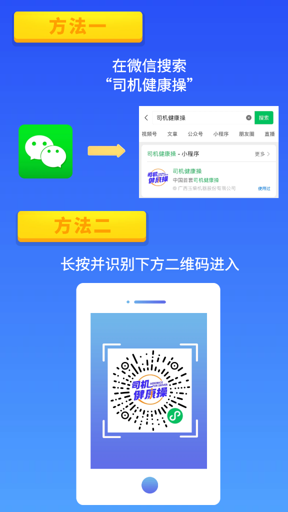 相比较其他APP而言,“司机健康操”微信小程序无需下载,只要在微信上搜索“司机健康操”或扫描以上二维码,即可打开该小程序,尽享科学、有效的健康服务。