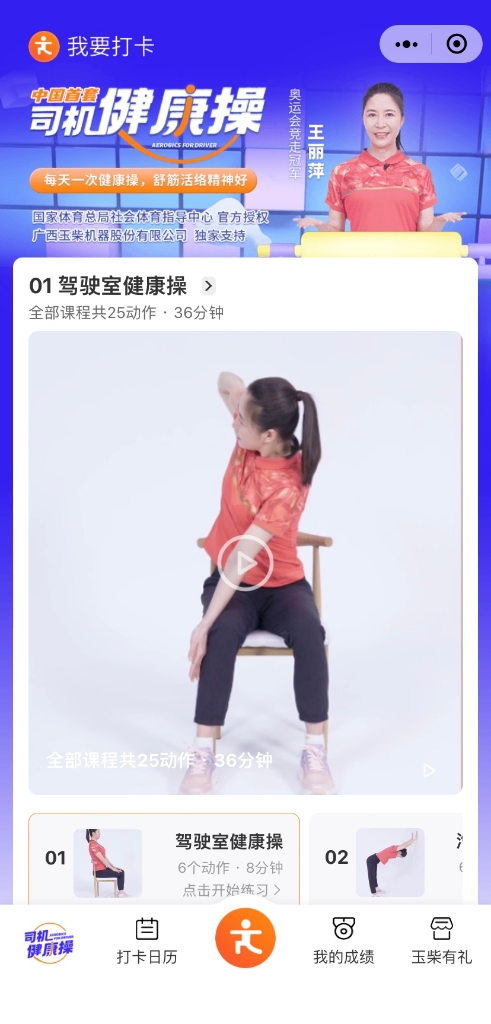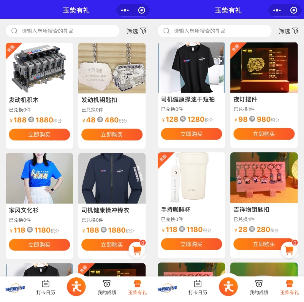“司机健康操”微信小程序是特为司机群体开发的公益型小程序,致力于为司机群体提供司机健康操教学、打卡锻炼、互动交友及健身装备兑换等一站式运动解决方案。为了鼓励用户关注自身健康,有动力打卡锻炼,玉柴还在小程序专门开发了“玉柴有礼”商城,用户可以通过打卡锻炼获得健康的同时,还可以通过打卡获得勋章和积分,并且可以用积分兑换商场上的蓝牙音响、高端定制保温杯、高定版发动机模型、坭兴陶竹节杯等精美礼品。
