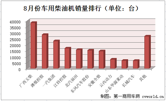 2014年8月份,车用柴油机销售199734台,销量排名前十的企业共计销售172735台,占据整个车用柴油机市场总销量86.48%的份额。排名如下: