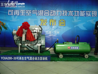 可再生空气混合动力技术是指在现有内燃机技术的基础上,在不添加任何蓄电池、电机等电力系统的情况下,利用专利技术回收制动过程中发动机产生的压缩空气,通过对回收的压缩空气进行有效管理,分别再利用于发动机启/停(start/stop)控制、低速增压补偿、整车气动系统供气补偿等,不但降低了常规车辆、尤其是城市公交车辆的使用燃油消耗和二氧化碳排放量,而且提高了整车的加速性能,消除加速时冒黑烟的现象。该技术具有以下六大优势:一是可再生压缩空气能量。二是具有优秀的节油效率。三是低碳排放。四是改善发动机性能。五是降低维护成本。六是成本优势。可再生空气混合动力技术的成功运用,充分体现了玉柴“绿色发发展,和谐共赢”的核心理念和“技术先行、绿色共赢”的一贯宗旨。作为中国最大的内燃机生产企业,多年来玉柴一直将产品技术发展放在突出位置,一直走“领选适用”的原则,始终坚持“生产一代、研发一代、谋划一代”,围绕“提升产品技术水平,完善产品结构”的技术创新路线展开了一系列产品研发,每一次产品的升级换代,玉柴都走在了国内行业前列。玉柴产品在技术上的领先地位,确保了玉柴产品在市场上的领先,带动了企业的飞速发展,据统计:作为独立的柴油发动机生产企业,从2001年起,玉柴的柴油机产销量已连续8年位居国内同行首位,连续8年保持两位数的高增长率;2009年1—11月,玉柴更是突破国际金融危机带来的不利影响,累计实现柴油机销量62万台,同比增长18.69%,继续续写逆势上扬的“玉柴现象”!