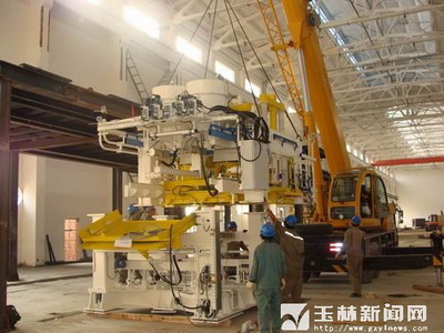 图为玉柴工业园重点项目玉柴铸造中心的技术人员正在吊装进口制芯中心的主要设备
