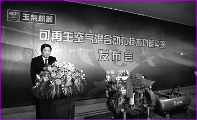 2009年底,玉柴机器发布了两项前沿的低碳动力新技术,这两项技术引领了低碳动力发展的新方向。12月21日,玉柴在玉柴工程研究院举行了“可再生空气混合动力技术功能实现”发布会,展示了玉柴和英国布鲁奈尔(Brunel)大学合作的最新成果——目前世界上第一台利用现有零部件技术实现可再生空气混合动力功能的发动机——YC6A280-30发动机。