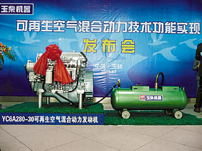 2009年底,世界上首台利用现有零部件技术实现可再生空气混合动力功能的发动机在玉柴成功问世。紧接着,又实现了低碳节能高效发动机在全国首次装车试运行。这是玉柴在核心技术方面取得的重大突破,达到了国际先进水平,更是玉柴在低碳经济发展中对人类的贡献:采用空气混合动力的发动机,不用添加任何蓄电池、电机等电力系统,通过改变机械设备就能达到减低燃油消耗和二氧化碳排放量的效果;低碳节能高效发动机投入公路运输,每台车每年至少能够减少二氧化碳排放5吨。