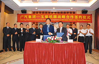 2009年6月,玉柴与广汽签署战略合作框架协议(前左为玉柴集团公司董事局主席晏平,前右为广汽副董事长曾庆洪)。