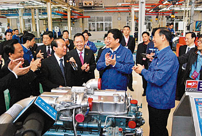 2009年12月11日,全国政协副主席、科技部部长万钢(前排右三)参观玉柴YCHPT混合动力系统并给予高度赞扬。