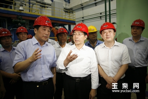 玉柴集团公司董事局主席晏平(前左一)陪同自治区党委书记、自治区人大常委会主任郭声琨(前左二)考察玉柴铸造中心