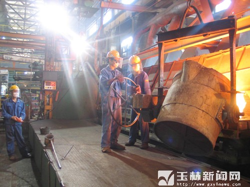 玉柴铸造厂机体车间熔化工段的工人们正在滚烫的铁水前挥汗如雨地工作着。