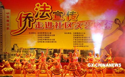 侨法宣传进社区是玉林市、玉州区围绕“五五”普法规划的任务目标,一个重要举措。今晚的侨法宣传晚会走进社区,不但能借助社区优势,在广大干部群众中传播法律知识、弘扬法治精神,而且能丰富社区活动内容、活跃社区文化。宣传晚会在群舞《金舞银铃》表演中推向高潮,精彩的文艺演出让广大社区居民享受一场丰盛的文化大餐同时,也上了一堂很好的侨法宣传课,收到很好效果。