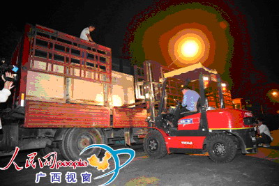 玉柴集团工人连夜将发电机组装车。(梅昌富摄影)