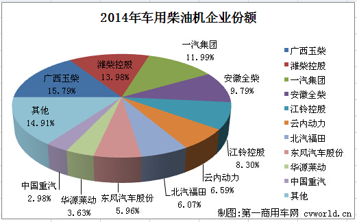 2014年,车用柴油机累计销售3234434台,销量排名前十的企业共计销售2752320台,占据整个车用柴油机市场总销量85.09%的份额。排名如下: