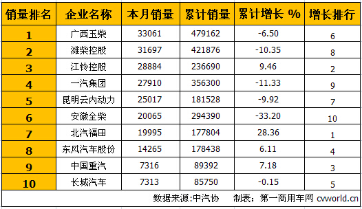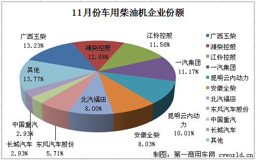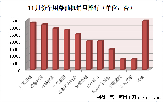 2014年11月份,车用柴油机销售249936台,销量排名前十的企业共计销售215523台,占据整个车用柴油机市场总销量86.23%的份额。排名如下: