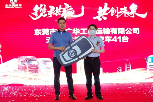 东莞市金广华工程运输有限公司是今天交车仪式主角之一,41台匹配YC6L330-58“国五+DPF"发动机的东风商用新型智能渣土车(DFH3310AX3)正式落户投入运营
